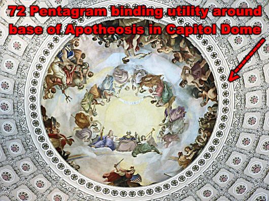 “…the designers of the Capital Dome, the Great Seal of the United States, and the Obelisk Washington Monument circled the Apotheosis of Washington with seventy-two stars, dedicated the Obelisk seventy-two years after the signing of the Declaration of Independence, and placed the seventy-two stones of the Great Seal’s uncapped pyramid, above which the eye of Horus/Osiris/Apollo stares. These three sets of seventy-two (72), combined with the imagery and occult numerology of the Osiris/Obelisk [penis], the Isis/Dome [womb], and the oracular Great Seal, are richly symbolic of the influence of Satan and his angels over the world (see Luke 4:5-6, 2 Corinthians 4:4, and Ephesians 6:12) with a prophecy toward Satan’s final earthly empire – the coming novus ordo seclorum, or new golden pagan age.”